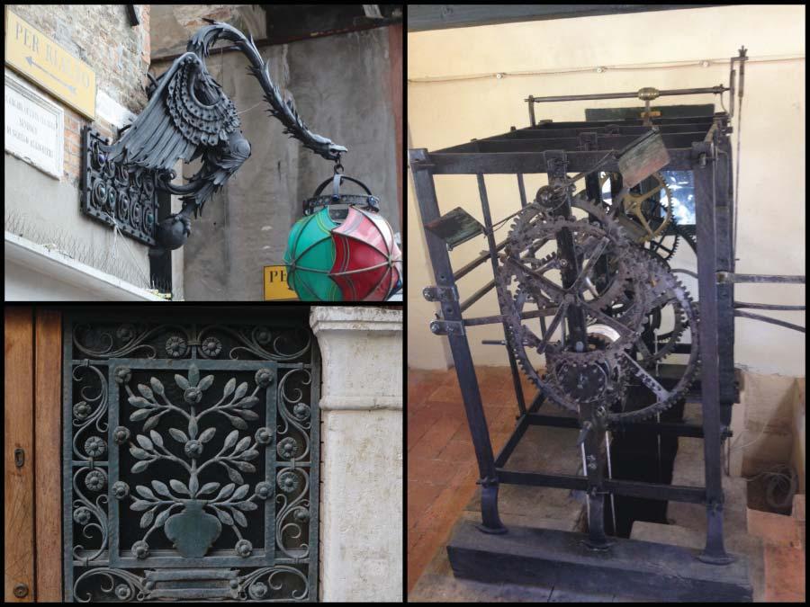 Figure1.8showsexamplesofearlywroughtiron.Theupperleftisadecorativesculpturalform, thelowerleftagrillemadefromwroughtiron,andtherightimageisanearlyclockmechanism madefromwroughtiron.