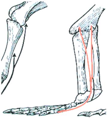In mammals, the functional joint is located between the zeugopod and the basipod. The talus is superimposed on the calcaneus which develops the sustentaculum tali, the fibula participates much less in the joint and regresses and the insertion of the gastrocnemius muscle is transferred to the calcaneal tuberosity, effectively increasing its strength (Figure 1.4).