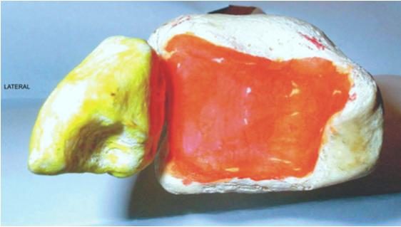 – shape of the talus: extended very transversely, the grooves are wide and the pulley (its anatomical shape) is well developed from front to back, giving a wide stance in an erect position whatever the degree of flexion/extension. The tarsus is wide and robust, adapted to the upright position, and the contact surface between the talus and the tibia is proportionally the most important. The bearing surface is estimated at 4.5 to 9 cm2;