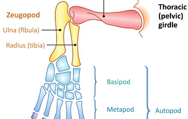 The structure is as follows (Figure 1.1): the proximal segment or stylopod is represented by the arm (humerus) or thigh (femur), the middle segment or zeugopod is the forearm (radius and ulna) or leg (tibia and fibula) and the distal segment or autopod, consisting of three parts, is the hand or foot. The basipod corresponds to the tarsus (and the carpus), the metapod to the metatarsus (metacarpus) and the acropod to the phalanxes.