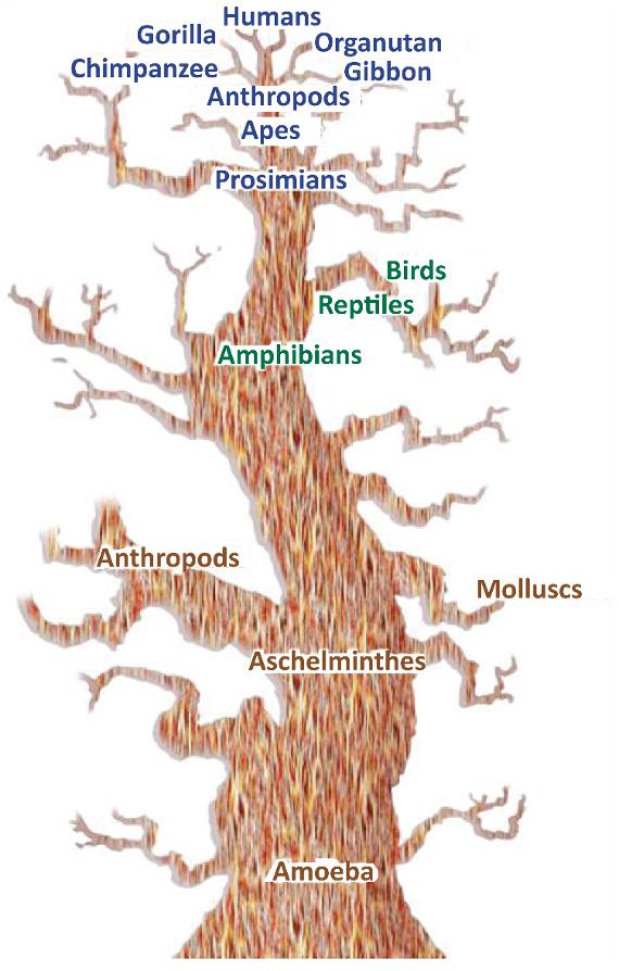 Figure 1.8. Haeckel’s phylogenetic tree placing humans at the top. For a color version of the figure, see www.iste.co.uk/cazeau/foot.zip