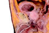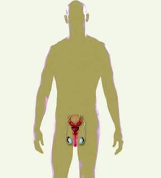peritoneal cavity, which contains most abdominal organs. A few organs are retroperitoneal (retro = backward), or located posterior to the peritoneum. These organs are the pancreas, kidneys, adrenal glands, and portions of the large intestine, small intestine, aorta and inferior vena cava. The pelvic cavity is the inferior portion of the abdominopelvic cavity. The pelvic cavity contains part of the large intestine, rectum, urinary bladder, female reproductive organs (ovaries, uterine tubes, uterus, vagina), and male reproductive organs (prostate, and part of ductus deferens). It is important to note that the testes and penis are not located in the pelvic cavity but are located inferior to it.