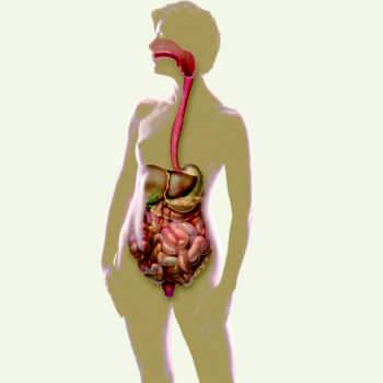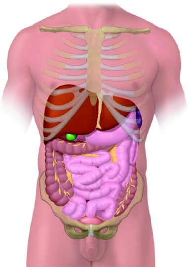 Anatomists divide the abdominopelvic cavity into nine regions using two vertical and two horizontal lines in a tic-tac-toe grid so that the location of any organ is simple to describe. The two vertical lines are drawn mid-clavicular (mid-collar bone) and just medial to the nipples, beginning at the diaphragm and extending inferiorly through the pelvic area. The upper horizontal line is drawn across the abdomen, inferior to the ribs and across the inferior portions of the liver and stomach. The lower horizontal line is drawn slightly inferior to the superior portion of the pelvic bones. These nine regions from the top right to the lower left are right hypochondriac (hypo- = under; chondro- = cartilage), epigastric (epi- = upon; gastro- = stomach), left hypochondriac, right lumbar (lumbar = loin), umbilical, left lumbar, right inguinal or iliac (inguinal = groin), hypogastric or pubic, and left inguinal or iliac. Clinicians are more apt to divide this cavity into four quadrants that are formed by transverse and sagittal planes running through the umbilicus (navel). These quadrants are useful clinically when one is trying to describe abnormalities or to determine which organ may be the cause of pain. The four quadrants are right upper quadrant (RUQ), left upper quadrant (LUQ), right lower quadrant (RLQ), and left lower quadrant (LLQ).