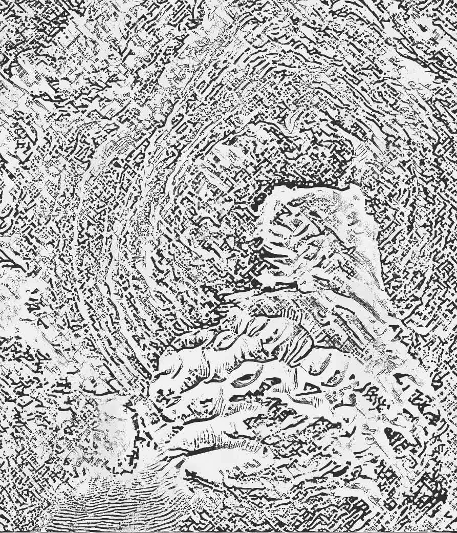 Plan-generation test. The image was produced by a generative network trained on thresholds from Il Campo Marzio dell’Antica Roma to create plans from satellite images of unbuilt regions. The plan responds to the features of the input site and attempts to negotiate them with its own understanding of poché/ void relationships producing a coherent but illegible order.