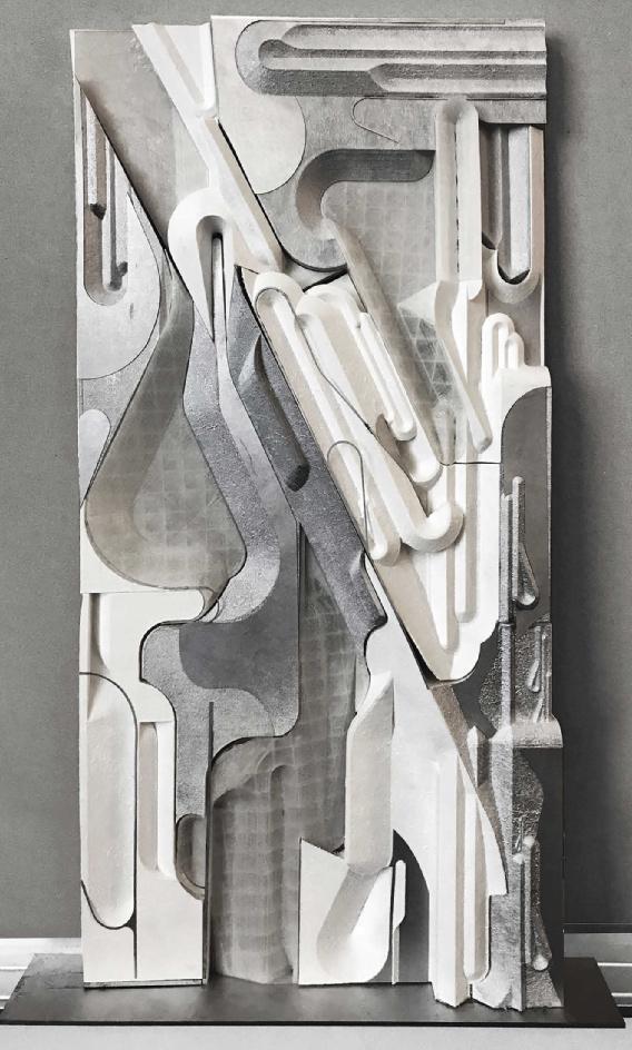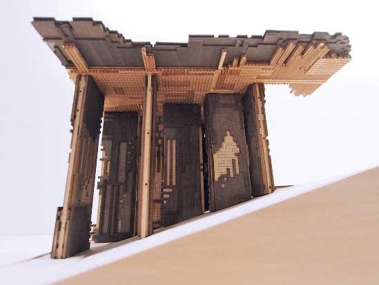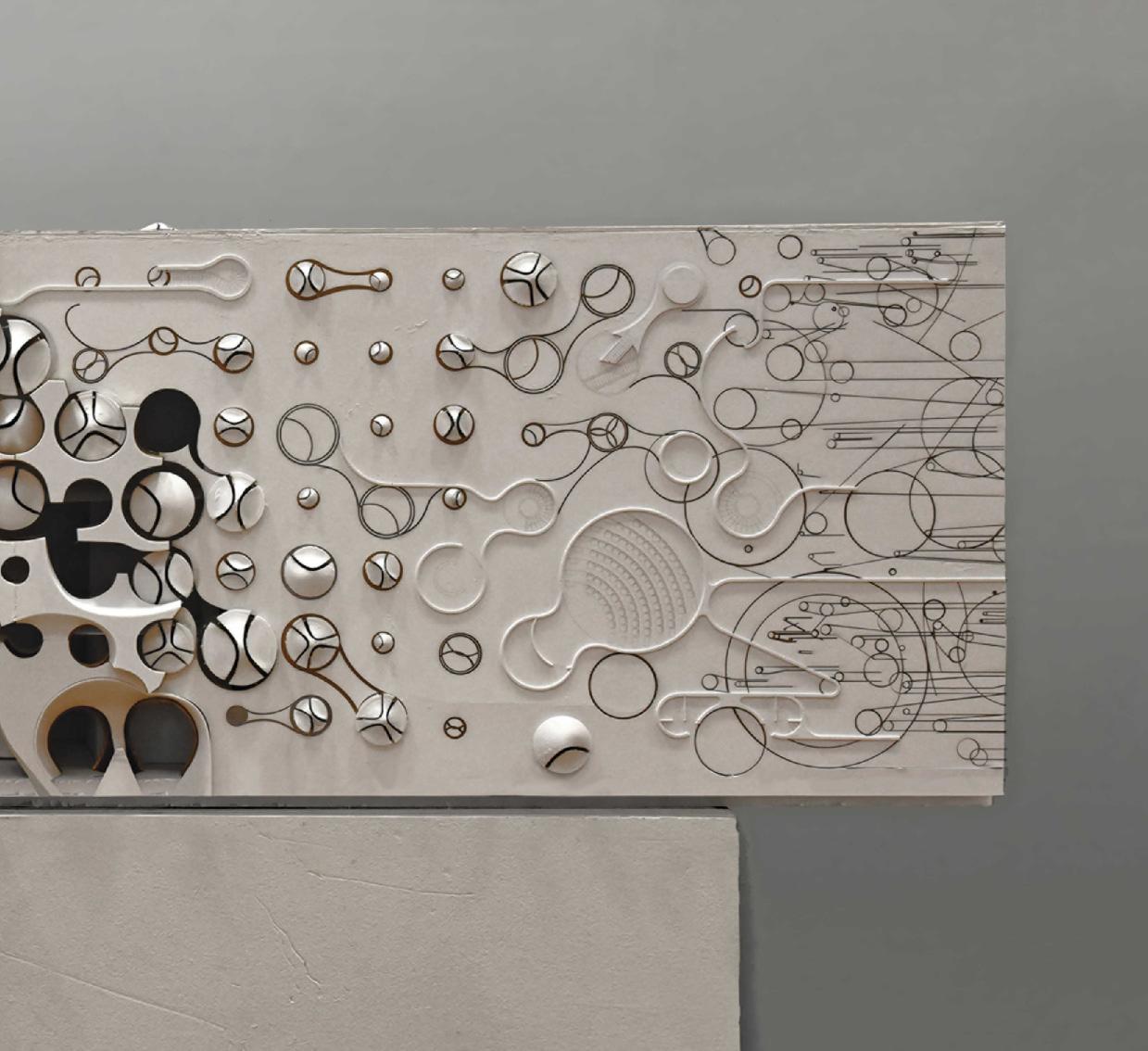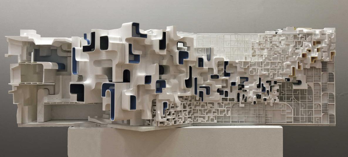 3D-printed polymer and laser-cut museum board model demonstrating the seamless integration of multiple materials to develop a new museum proposal.