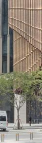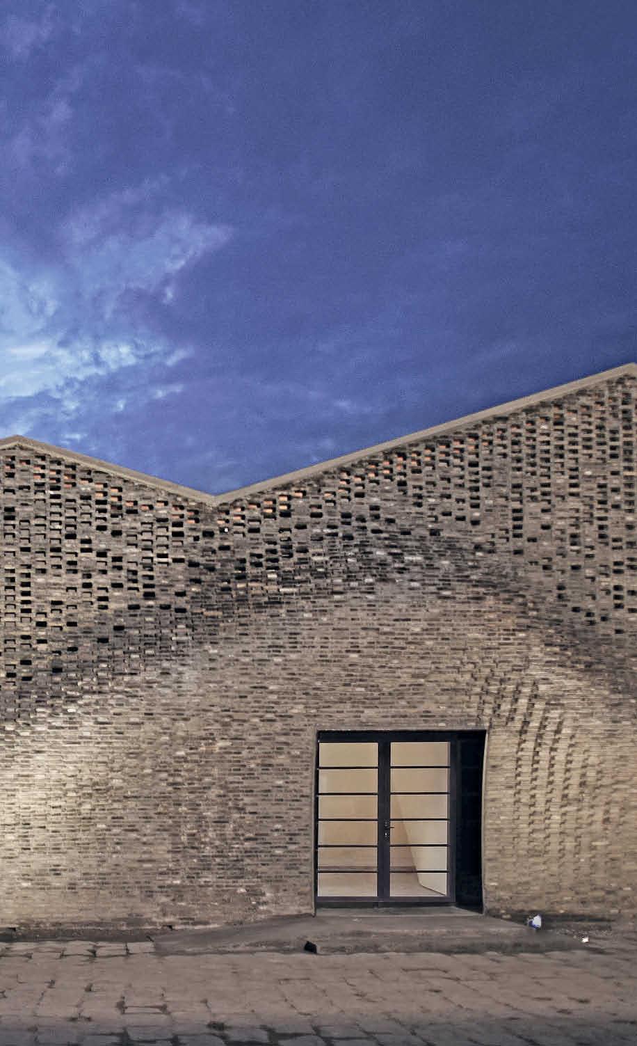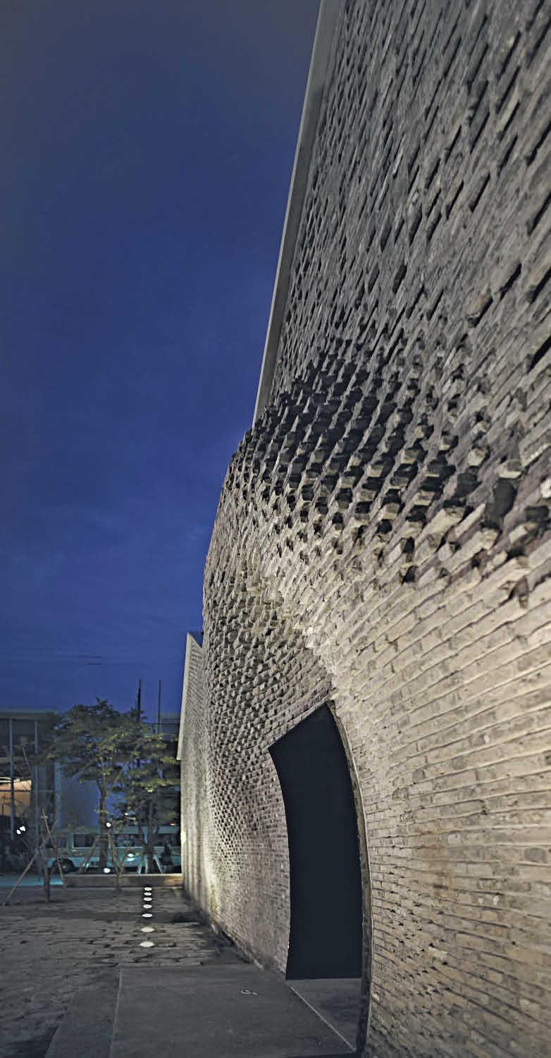The precision of robotic construction allows for traditional brick to be free in its expression while still meeting modern structural requirements. The worn old brick and the drama of the curved wall complement one another; together they tell a story of humans and bricks, machine and construction, design and culture in the changing shadows of the facade wall.