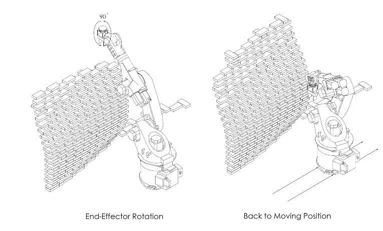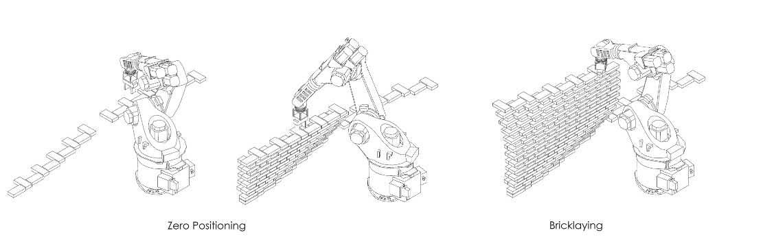 The complete robotic masonry process consisted of the following steps: positioning the brick at the origin point where it becomes visible to the robot; commencing the construction of one masonry unit; lifting the robot after completing one masonry unit and moving it to the next point for construction of the next masonry unit; and commencing the construction of the new masonry unit.