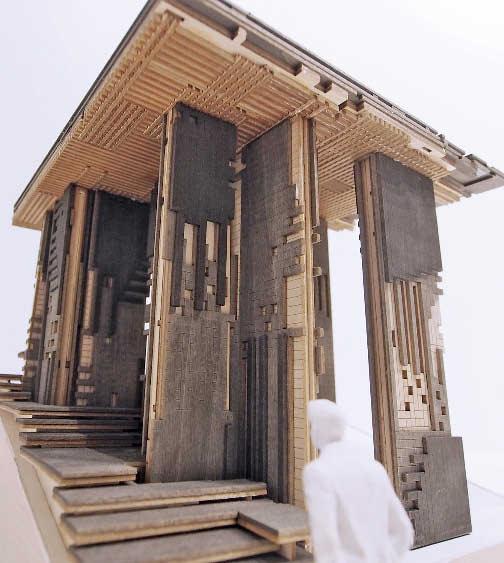 above: Sectional model highlighting the processional effect of the assembled panel elements in defining spaces along the primary staircase of the pavilion. The stairway and the flooring float between the vertical panels like a balloon frame structure, negating the need for fixed levels.