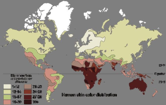 amount of ultraviolet (UV) rays to which an individual’s ancestors were subjected in the very long term [JAB 10] (short-term exposure to the sun, as we have all seen, also has a temporary influence on skin color). To withstand the solar stress they face, dark-skinned sapiens near the equator2 have a melanin production system (UVabsorbing brown-black pigments and protectors against solar stress) that is more effective than that of their light-skinned counterparts. Thus, light-skinned humans, who migrated from Europe to equatorial Africa and stayed there for 10,000 years, inevitably saw their skin change, provided they lived a good part of their time outside, and not shut away in air-conditioned houses writing tweets, draped in long dressing gowns. In any case, if the current phase of global warming were to prove very sustainable, humanity would tend to darken in terms of their skin.