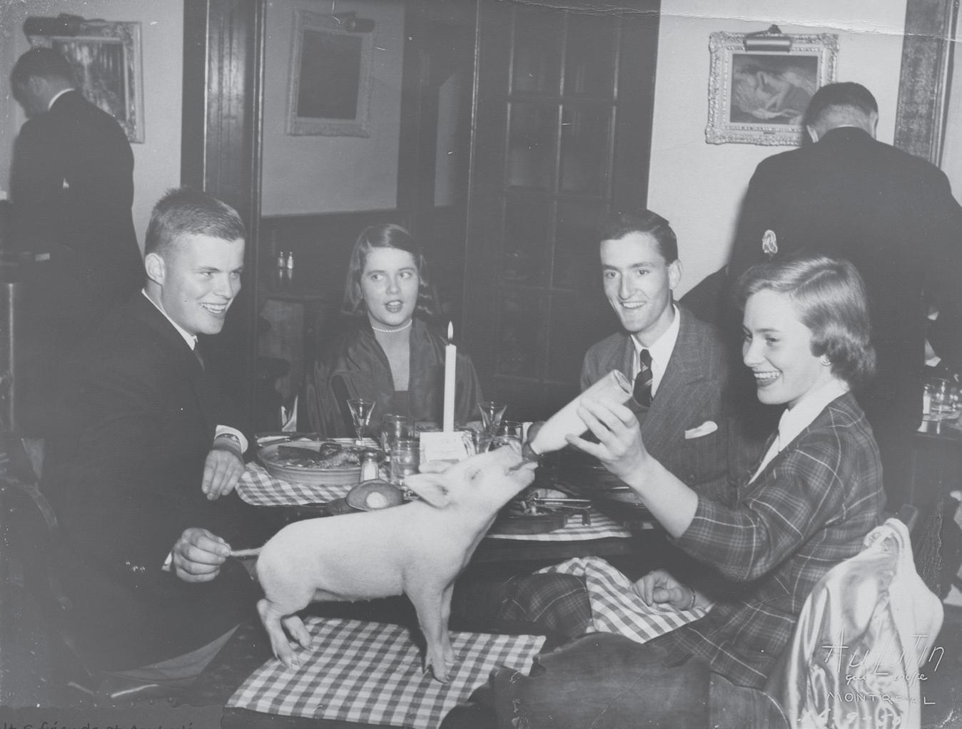 John with his friend Jacques Tétrault and two young women, one of them feeding a piglet in the landmark Montreal restaurant Au Lutin Qui Bouffe.