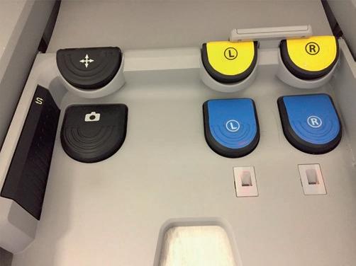 Located on the floor beneath the console is the footswitch panel. It contains three pedals to the left side (camera control, main clutch and the control of arms swap). There are other pedals to the right side (coagulation and cutting diathermy pedals) which are connected at the back of the console through coloured cables to the electrosurgical generator (Fig. 4.3).