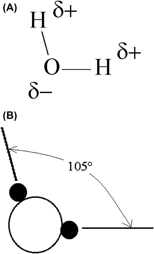 Figure1.5 Theshapeofthewatermolecule.(A)Stickrepresentationshowinginduced charges,whichresultinhydrogenbonding,and(B)ballmodelshowingtheangle betweenthehydrogenmolecules.