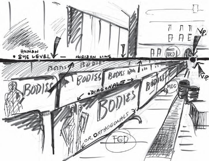 Figure 1-4 This is a structural sketch of the entrance to the anatomical bodies exhibit at the South Street Seaport in Manhattan. Notice the one-point perspective with the vanishing point in the upper righthand corner of the picture.