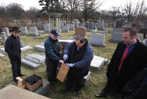 Jim McReynolds (second from right) from the Philadelphia Police Department collects evidence at the Mount Carmel Cemetery in February 2017. More than 100 headstones were vandalized at the Jewish cemetery less than a week after similar vandalism occurred in Missouri.