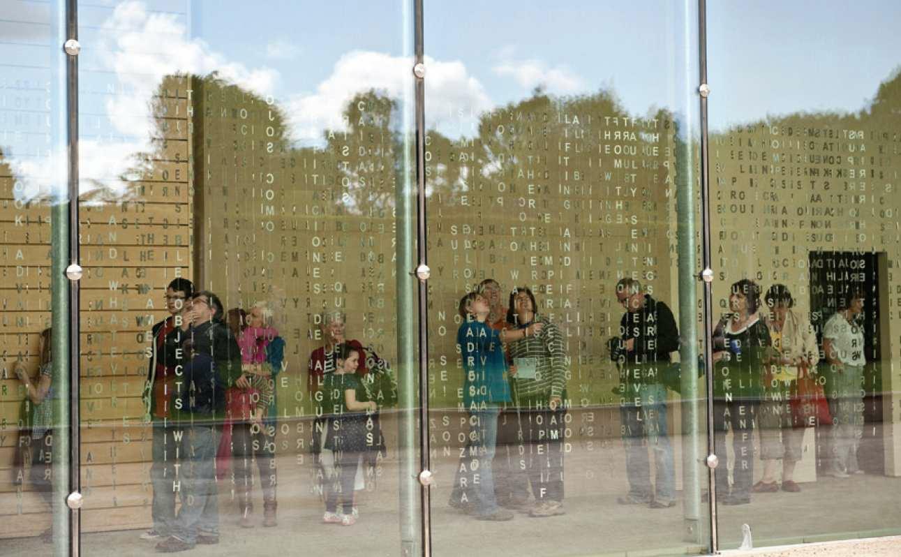 Jaume Plensa is a sculptor and artist from Spain. His installation 29 Palms, shown above, is a 164-foot curtain composed of steel-cut letters comprising his favorite poems. The letters are designed to cast fluid shadows across the wall and floor. In the photo, a visitor touches the letters to make them “sing,” as Plensa encourages. Reflect on this tactile, three-dimensional, multimedia presentation of letters, which we often encounter in static settings, like books and screens. What does Plensa’s installation seem to be saying about the role of words in our world, and its relationship to language?