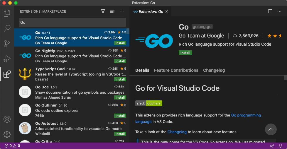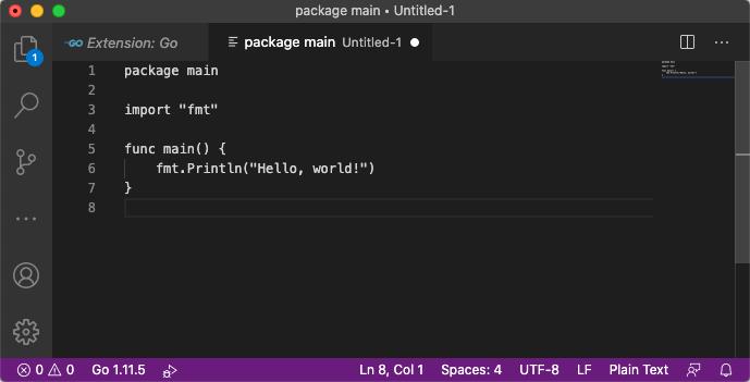 In order for Visual Studio Code to recognize your Go language syntax, you also need to install an extension for it. Follow these steps to install the Go extension:
