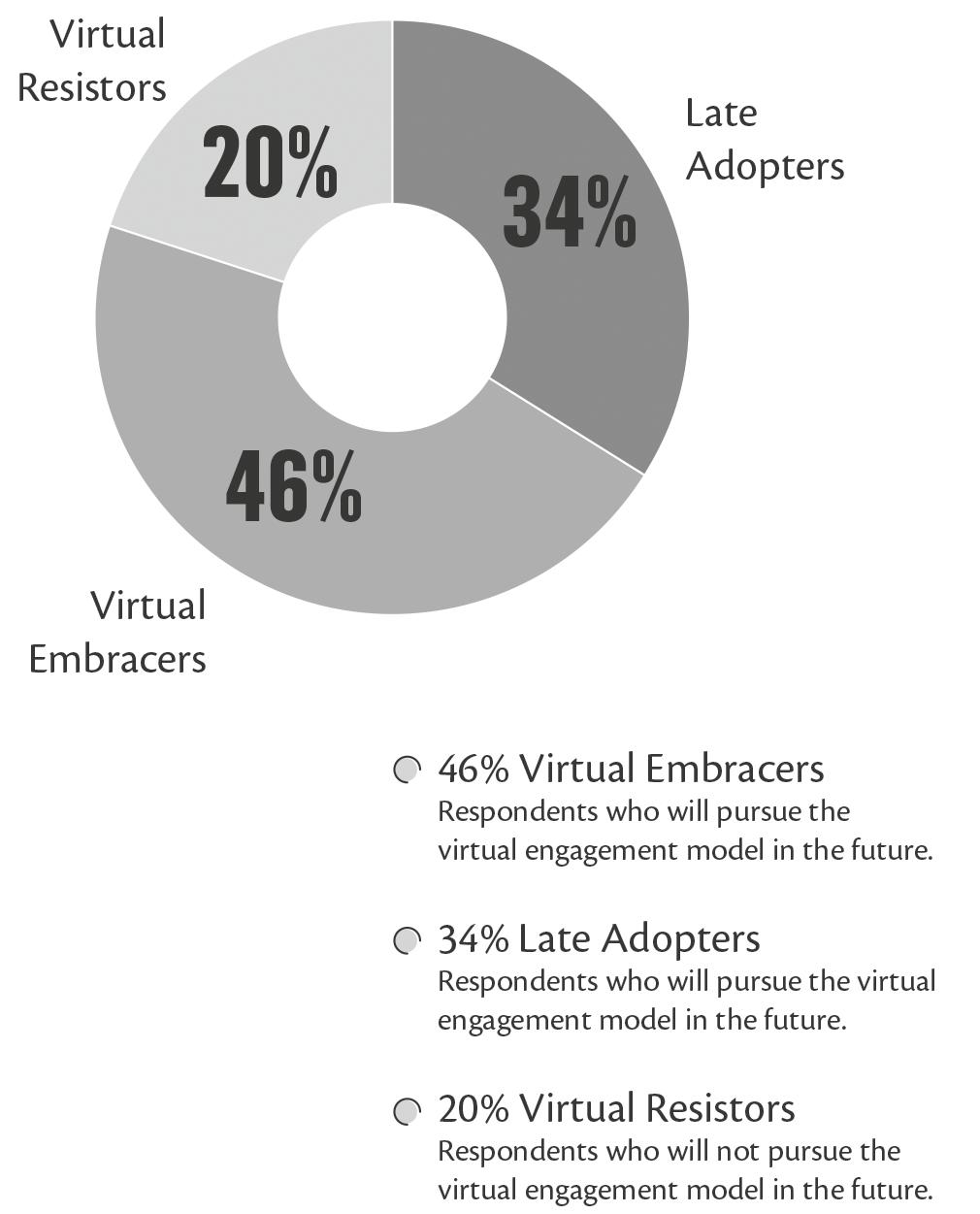 The adoption of new technology and new ways of working follow a predictable path. First, you see innovators trying new technologies and ways of working simply because they are new and different. The early adopters follow the innovators and are then followed by the early majority. The late majority join next and finally the laggards come on board. In our recent virtual sales study, we found that 80% of respondents can be classified as virtual embracers or late adopters: commercial employees characterised by their willingness to pursue more virtual customer meetings in the future. Only 20% were classified as virtual resistors—those who expect to go fully back to a physical “normal” face-to-face model once the pandemic has ceased.