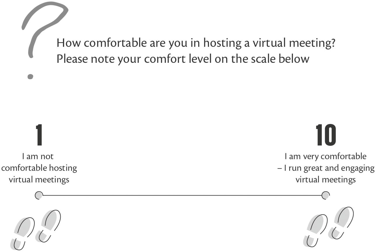 We will explore this idea of comfort later in the book, but the reason we are telling you this is because how you rate your comfort level appears to be key to the level of success you have in virtual meetings. If you are not comfortable with hosting meetings in a virtual environment, then it is not realistic to expect them to go well.