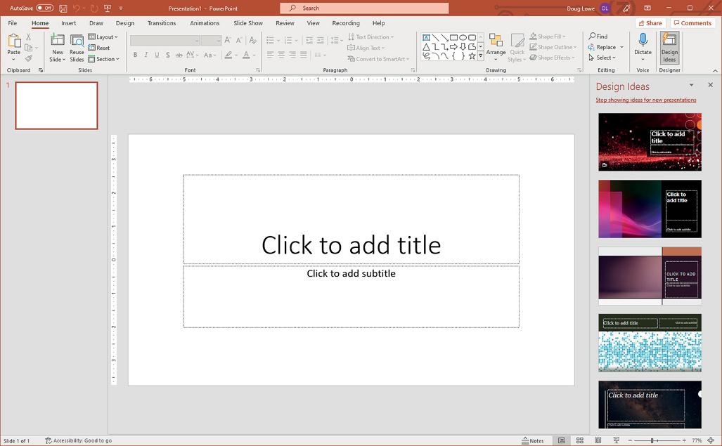Throughout the rest of this chapter, I introduce you to some simple techniques for turning a blank presentation into an actual presentation with real content. I recommend following along with the numbered steps in later sections of this chapter so you can get a feel for how to create a simple presentation in PowerPoint.