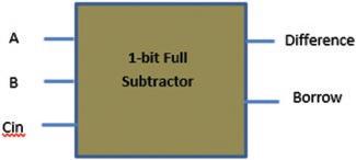 This performs the arithmetic difference of three inputs and gives corresponding two outputs in terms of Diff. and Borrow. A block diagram of the F. subtractor is shown in Figure 1.14. Table 1.10 provides output variables (Difference, Borrow) of the full subtractor in terms of inputs (A,B).