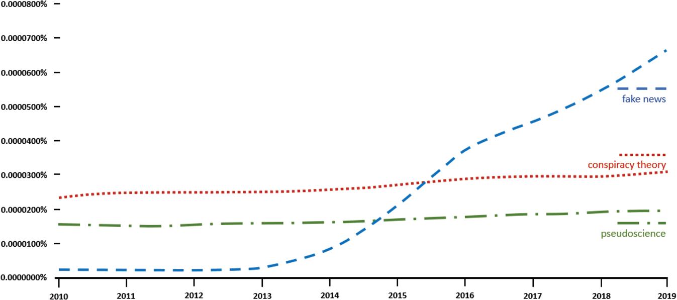 Figure 2.1 Google nGram of pseudoscience, conspiracy theory, and fake news (September 2, 2020, case insensitive, smoothing, adapted).