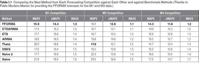 J The most recent method (FFORMA) outperforms the other methods on every measure for the M1 and M4 competitions, and on all but the MAPE measure for the M3 competition.
