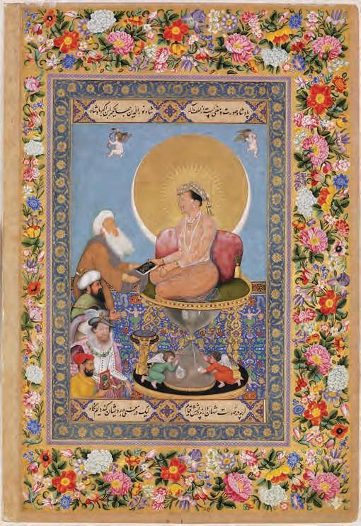 The Emperor Jahangir sits on a throne supported by an hourglass whose sand has almost run out. Yet, on the glass, cupids are painting a prayer that he might live for a thousand years. What could resolve this contradiction? It must be the act of painting itself, one of the great passions of the cultured emperor. There were many signs of Jahangir’s special love during his reign. One of the greatest royal patrons of arts in history, he provided studios in the palace for his court artists and gave them the finest and most expensive materials to work with. The artists rewarded him with immortality.
