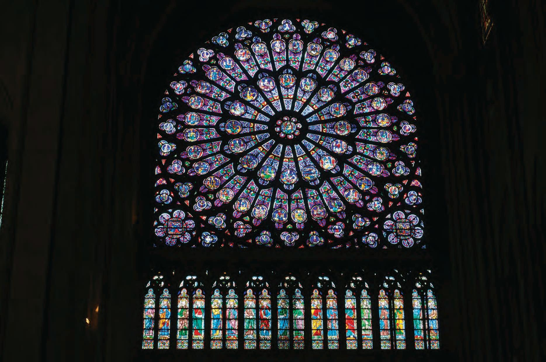 Just as the Amida Buddha (1-5) embodies the beliefs of Japanese Buddhism, the Gothic cathedral of Notre Dame (1-14) in Paris is a visual expression of the Christian faith of the medieval era. With its soaring vertical lines, the cathedral seems to lift the soul heavenward, toward God. Its stained-glass windows tell biblical stories (1-15); its paintings and statues can instruct and even inspire the viewer. By transforming a material as dense and heavy as stone into a structure of such grace, the cathedral becomes a visual representation of the Christian belief in a spiritual existence beyond and above the limitations of physical reality. This heavenly realm is visually symbolized as the viewer’s eye is drawn up the soaring lines of the gothic arches to the very top of the pointed vaults and into a space bathed in colored light. Within Notre Dame cathedral, we can experience the power of art to transform the physical act of viewing into the spiritual act of worshipping.