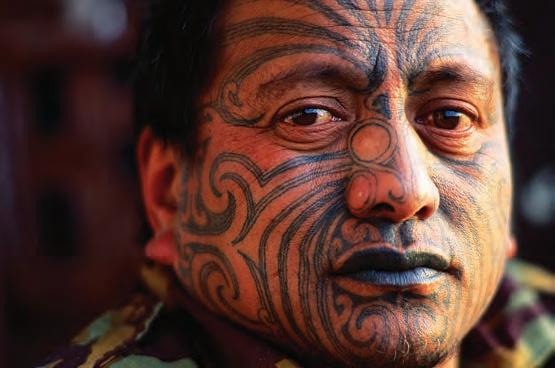 pigment into the skin by a variety of means, most commonly needles. Although a tattoo can still be controversial in twenty-first-century America, it is just the opposite for the Maori tribes of New Zealand. Its creation is a sacred act, and the tattoo artist is considered a holy person. Their traditional method utilizes very sharp bone chisels to cut lines into the skin. Next, a chisel is dipped into natural pigments such as charcoal or dried caterpillars, which are shaken into the wounds to add colors. Tattooing was a coming-of-age rite for young men and women that demonstrated an adolescent’s strength and courage. It was a matter of pride to never make a sound as the cuts were made. Because the chisels left grooves, a long, painful healing process followed. While the recently tattooed young people rested and fasted afterward, they were soothed by sweet flute music and numbing leaves applied to their swollen skin.