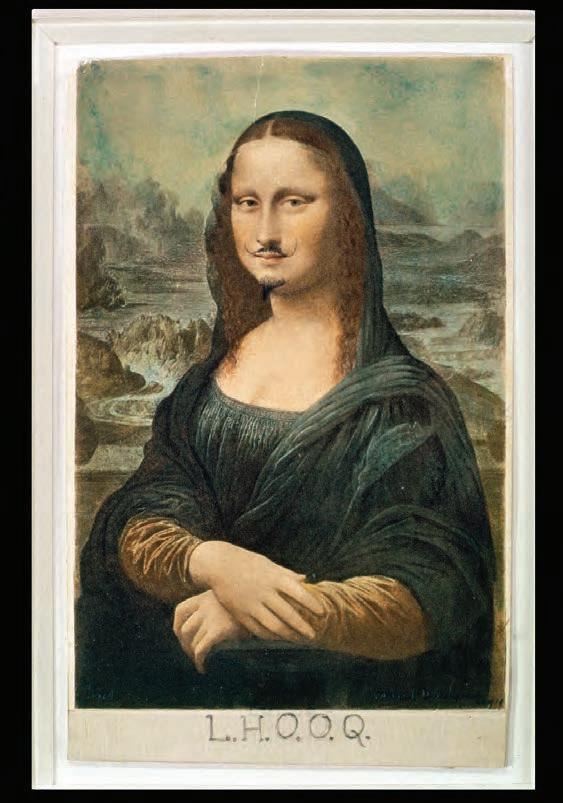Related to art’s power to change our point of view is its power to shock us. In the early twentieth century, many artists wanted to create works that would wake viewers up and shake them out of their preconceptions about art. One such artist was Marcel Duchamp, and one of his most disturbing pictures was L.H.O.O.Q (1-21), a sat ire of Leonardo da Vinci’s Mona Lisa. Duchamp chose to make fun of the Mona Lisa, especially because it was so beloved and had become almost like a sacred image to people who cared about art. He took a postcard repro duction of the painting, added a moustache, beard, and dark pupils in pencil, and then printed a few initials at the bottom. When pronounced in French, these initials sound out the vulgar phrase, “she has a hot ass.”