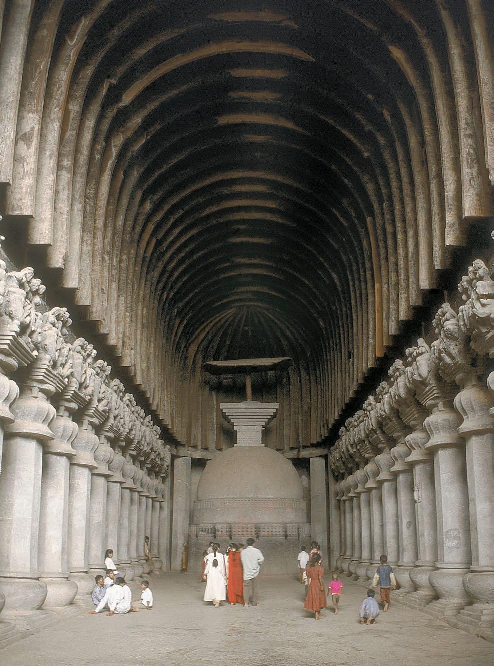 An early example of Buddhist architecture, the chaitya hall at Karle is carved out of the living rock. It has a pillared ambulatory that allows worshipers to circumambulate the stupa in the apse of the cave.