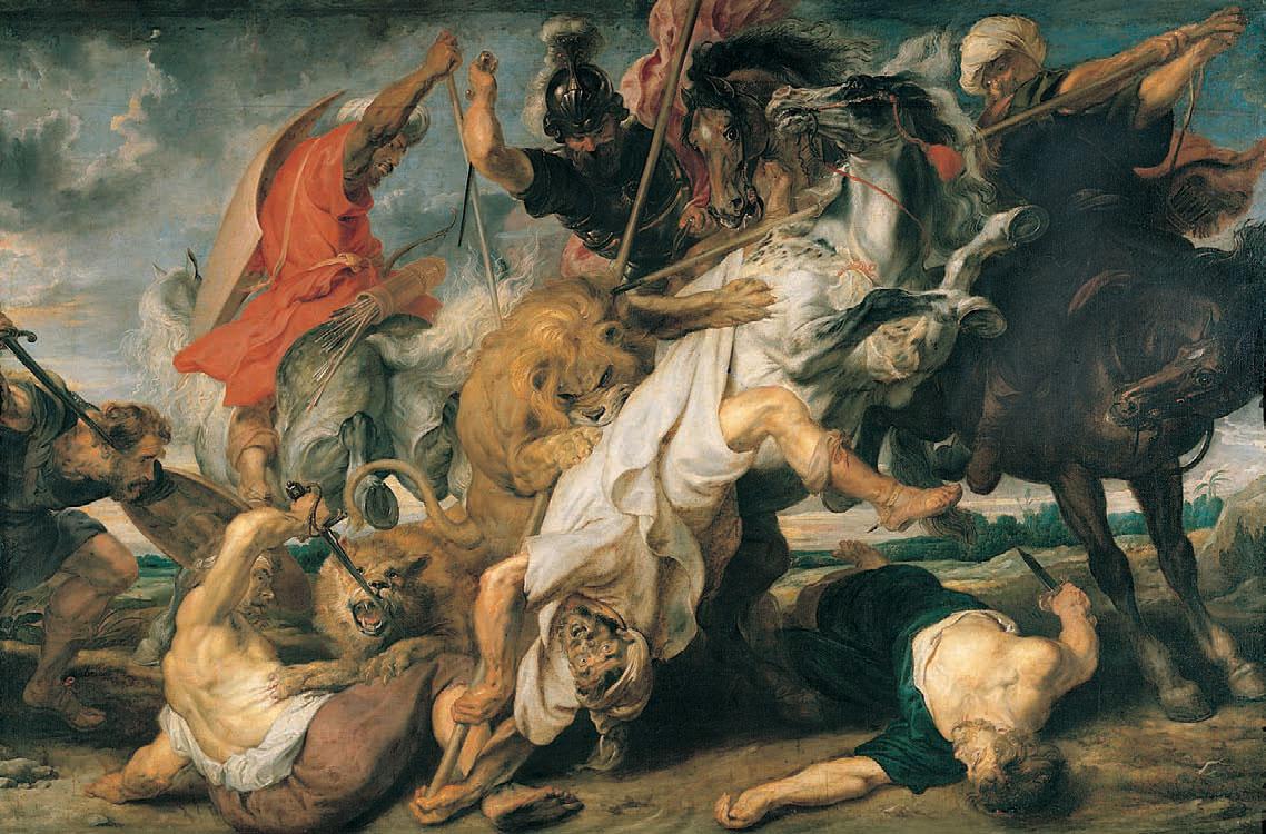 Artists also represent single figures in space in varying ways. When the Flemish artist Peter Paul Rubens (1577–1640) painted Lion Hunt (FIG. I-4),he used foreshortening for all the hunters and animals—that is,he represented their bodies at angles to the picture plane.When in life one views a figure at an angle,the body appears to contract as it extends back in space.Foreshortening is a kind of perspective.It produces the illusion that one part ofthe body is farther away than another,even though all the forms are on the same surface.Especially noteworthy in Lion Hunt are the gray horse at the