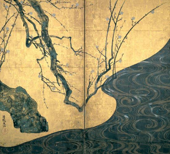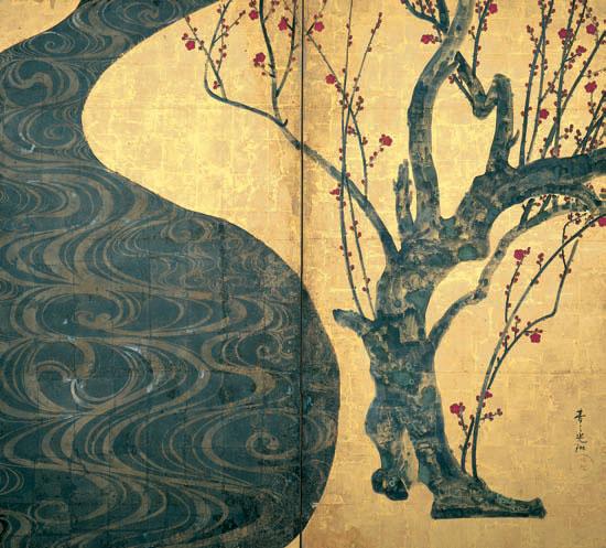 I-3 Ogata Korin, White and Red Plum Blossoms, Edo period,ca.1710–1716.Pair oftwofold screens.Ink,color,and gold leafon paper,each screen