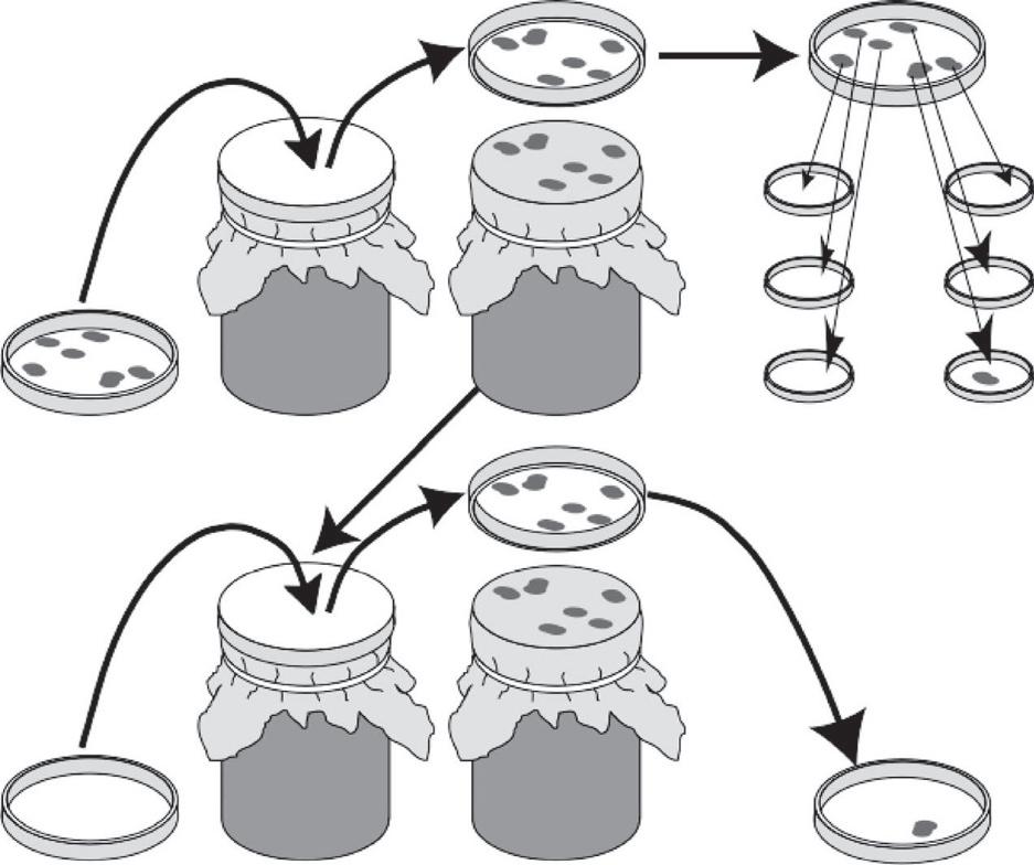 Figure1.1 Replicaplating.AsuspensionofbacterialcellsisspreaduponaPetridish(plate1)suchthateach individualbacteriumshouldbewellseparatedfromallothers.Eachbacteriumthengrowsintoacolonyof geneticallyidenticalindividuals.Next,acircularblockcoveredwithvelvetispressedontothesurfaceofplate 1.Somebacteriafromeachcolonysticktothevelvet,soaduplicateoftheoriginalplateismadewhenthe velvetispressedontothesurfaceofasecondPetridish(plate2),calledthereplicaplate.Themediumonthe replicaplatecontainsstreptomycin,anantibioticthatkillsmostbacteriafromtheoriginalstrain.Inthe exampleillustrated,onlyonebacterialcolonyonthereplicaplatecangrowonstreptomycin,anditsposition onplate2identifiesitasthedescendantofaparticularcolonyonplate1.Eachbacterialcolonyonplate1is thentestedforgrowthonaplatewiththeantibioticstreptomycin.Ifmutationswererandomandstreptomycin simplyselectedpreexistingmutationsratherthaninducingthem,thenthecoloniesonplate1thatoccupied thepositionsassociatedwithresistantcoloniesonplate2shouldalsoshowresistance,eventhoughthese colonieshadnotyetbeenexposedtostreptomycin.Asshown,thiswasindeedthecase.