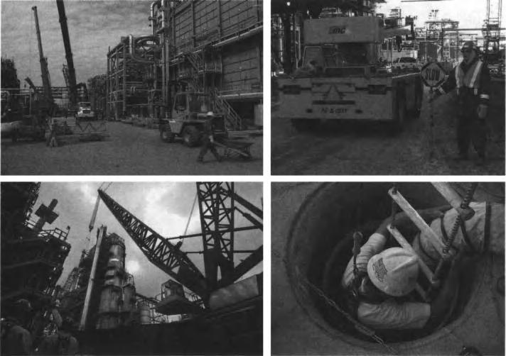 The activities pictured above are common on a construction site and represent a high level of energy. Heavy loads and moving equipment can easily distract a worker and direct his or her attention from the work at hand. Construction hazards are particularly critical when modifications are made on an operating plant site A vehicle impact or collapsing crane boom can damage delicate process equipment, releasing the contents to atmosphere This may cause further injuries