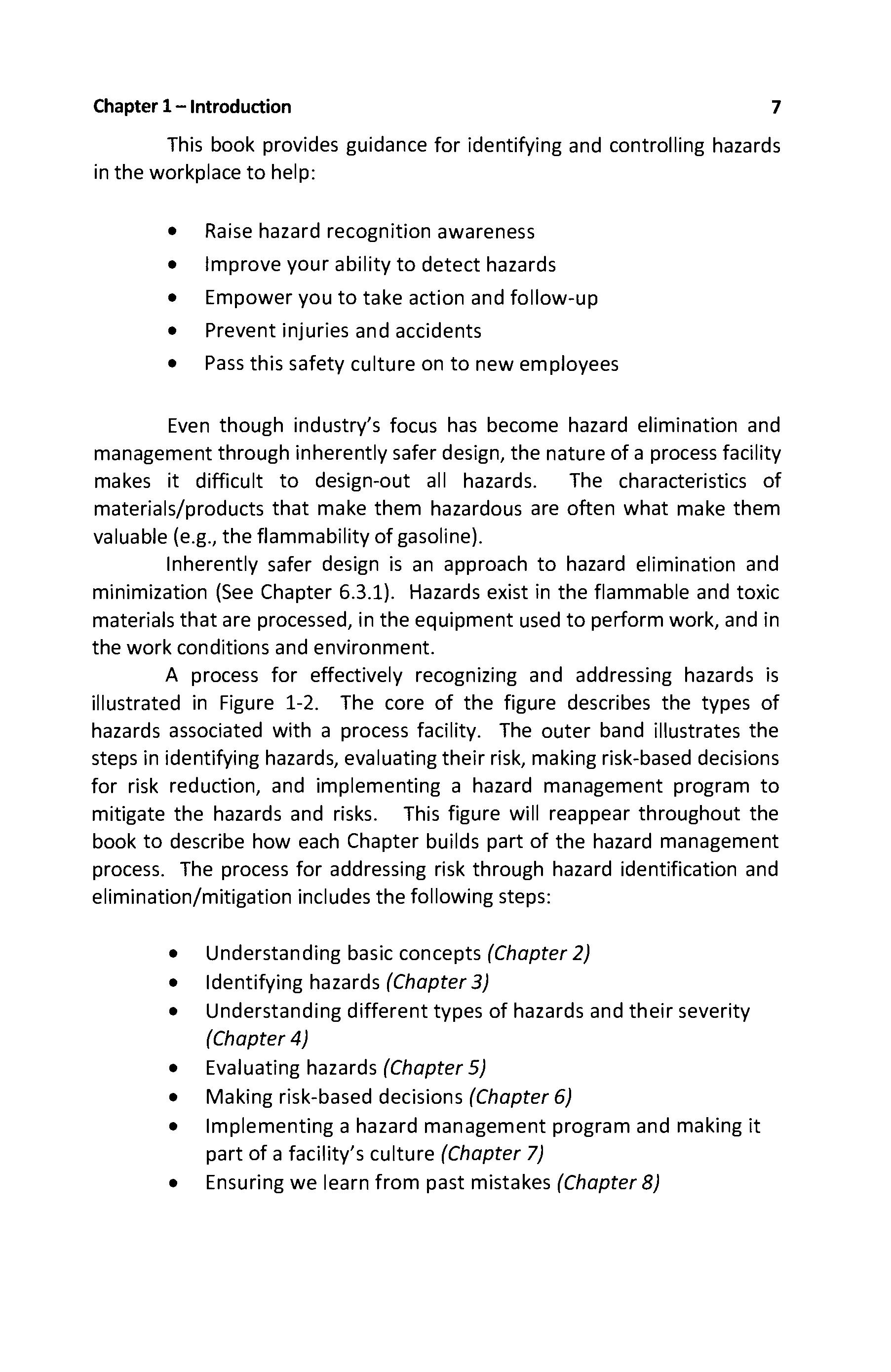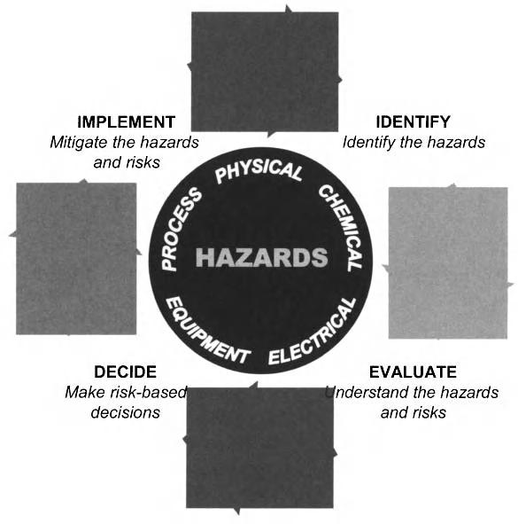 A process for effectively recognizing and addressing hazards is illustrated in Figure 1-2 The core of the figure describes the types of hazards associated with a process facility The outer band illustrates the steps in identifying hazards, evaluating their risk, making risk-based decisions for risk reduction, and implementing a hazard management program to mitigate the hazards and risks. This figure will reappear throughout the book to describe how each Chapter builds part of the hazard management process The process for addressing risk through hazard identification and elimination/mitigation includes the following steps: