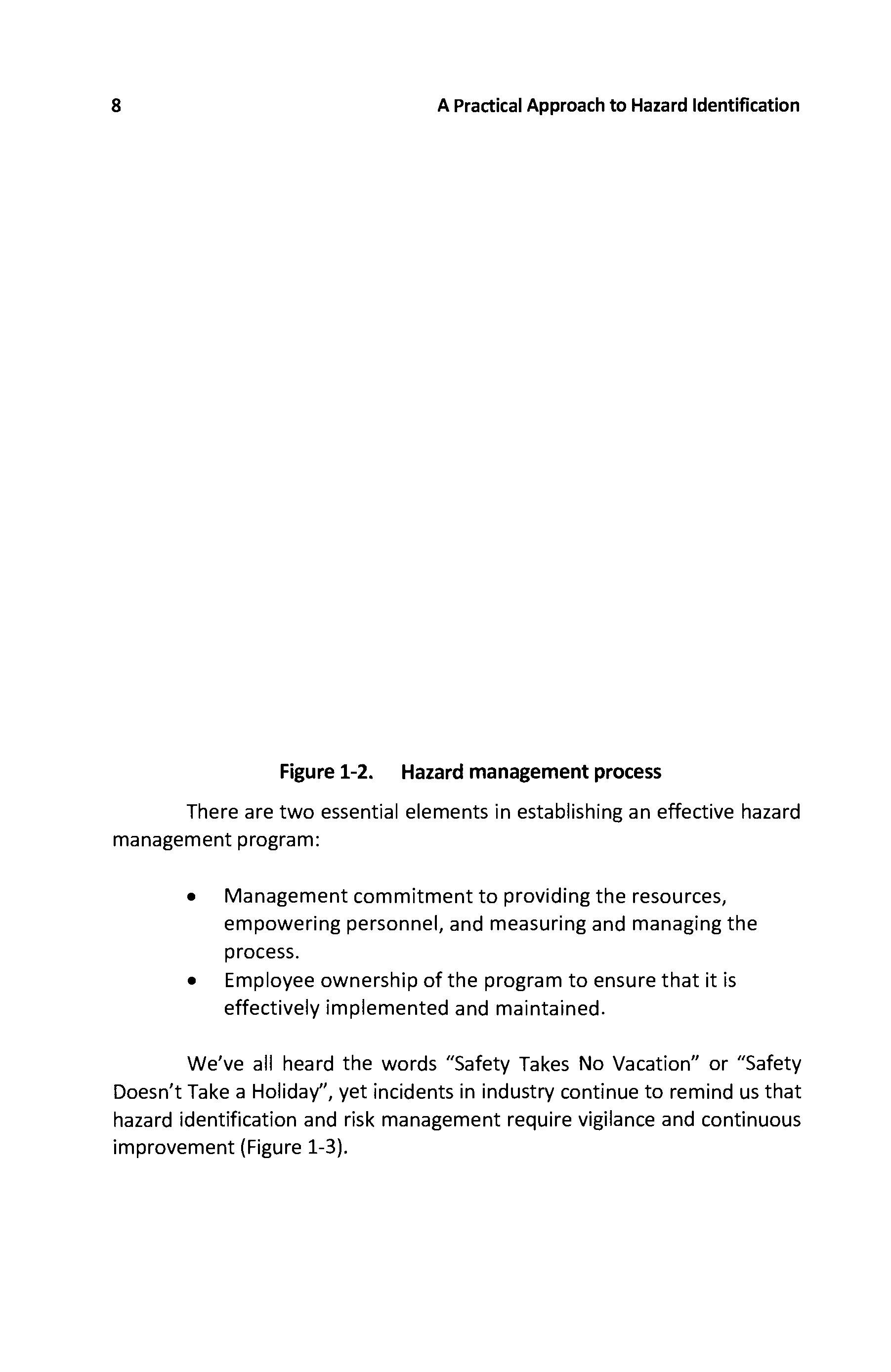 We've all heard the words "Safety Takes No Vacation" or "Safety Doesn't Take a Holiday", yet incidents in industry continue to remind us that hazard identification and risk management require vigilance and continuous improvement (Figure 1-3)