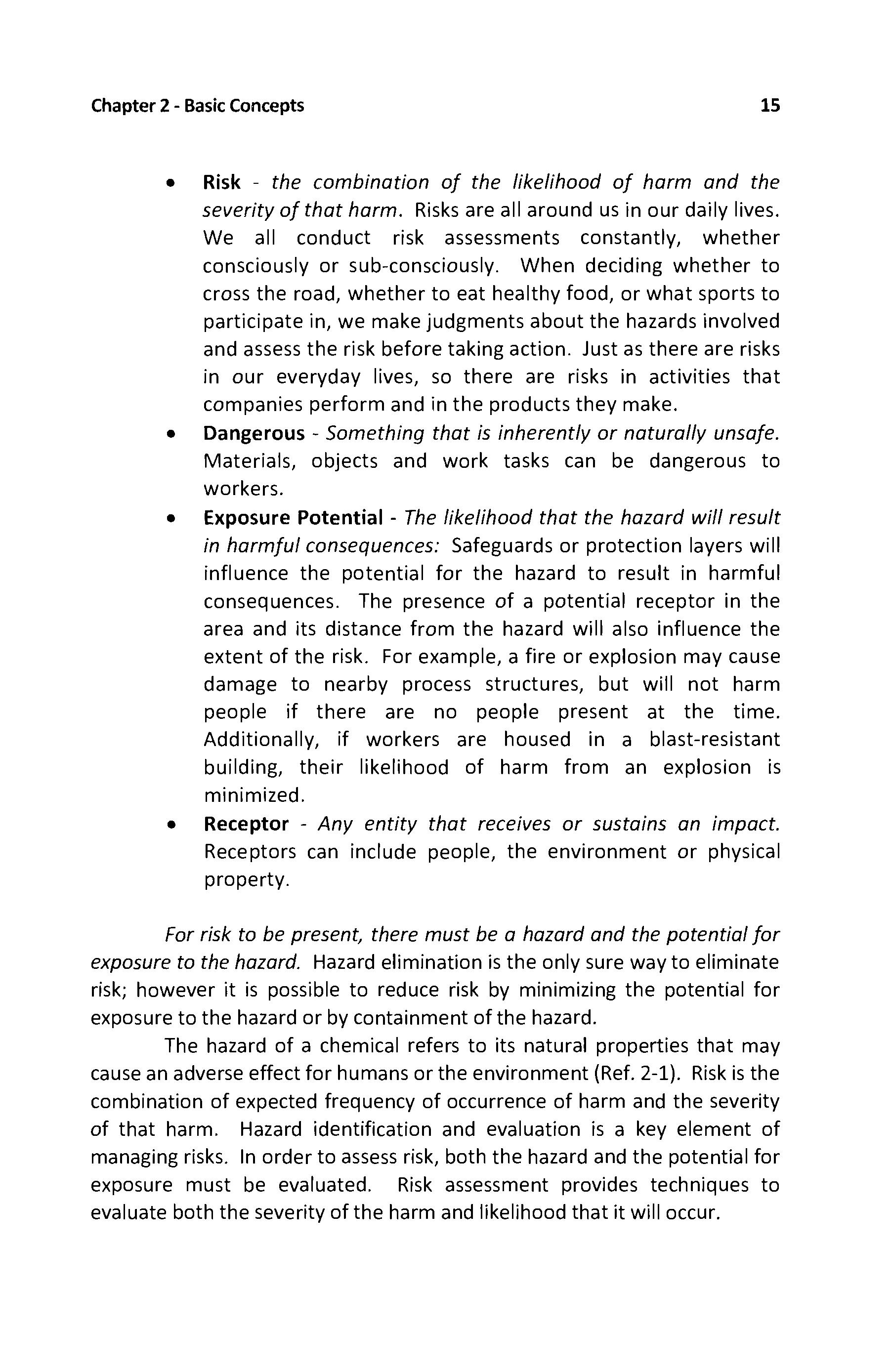 The hazard of a chemical refers to its natural properties that may cause an adverse effect for humans or the environment (Ref. 2-1). Risk is the combination of expected frequency of occurrence of harm and the severity of that harm Hazard identification and evaluation is a key element of managing risks In order to assess risk, both the hazard and the potential for exposure must be evaluated Risk assessment provides techniques to evaluate both the severity of the harm and likelihood that it will occur.