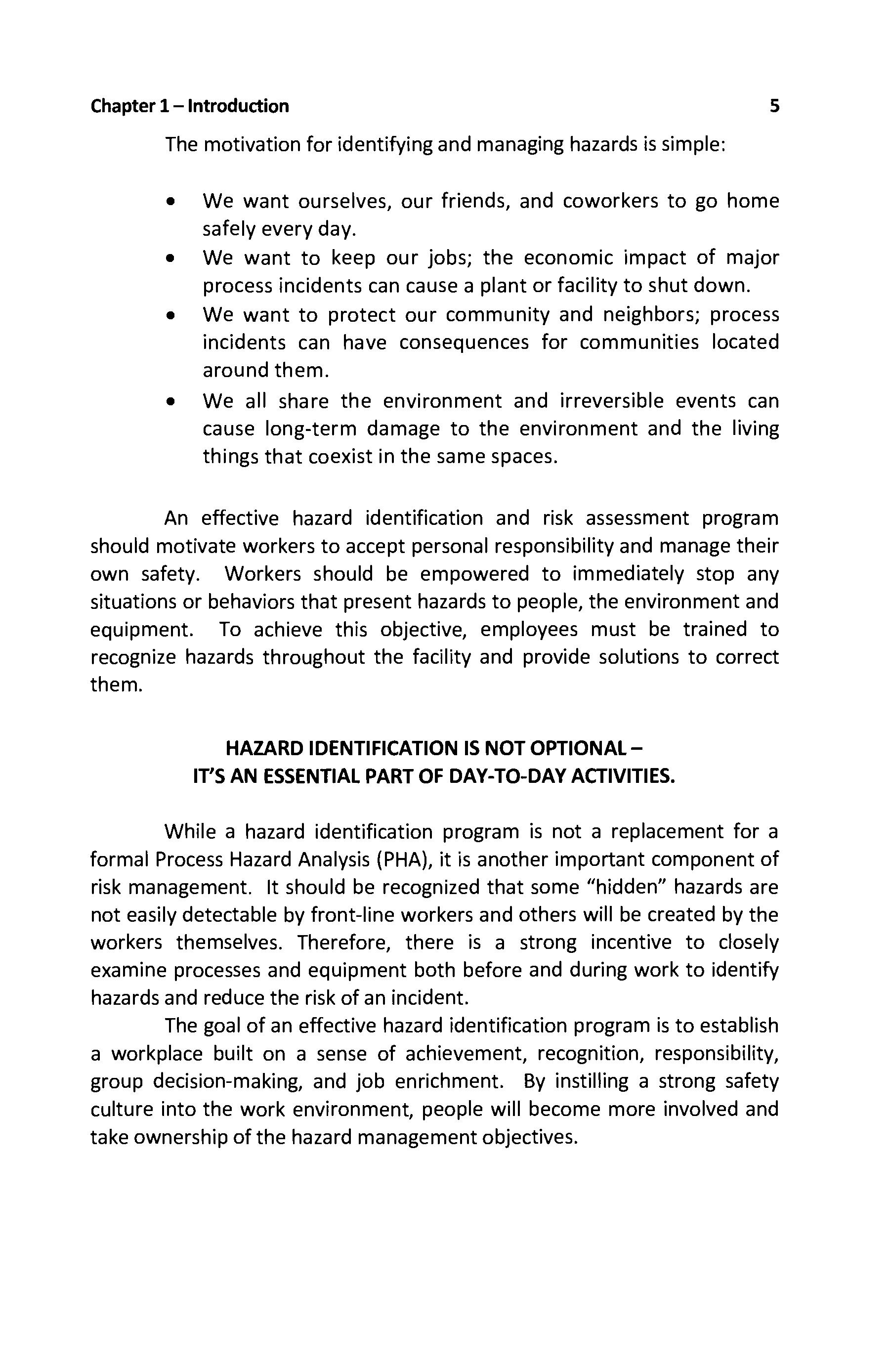 While a hazard identification program is not a replacement for a formal Process Hazard Analysis (PHA), it is another important component of risk management It should be recognized that some "hidden" hazards are not easily detectable by front-line workers and others will be created by the workers themselves Therefore, there is a strong incentive to closely examine processes and equipment both before and during work to identify hazards and reduce the risk of an incident.