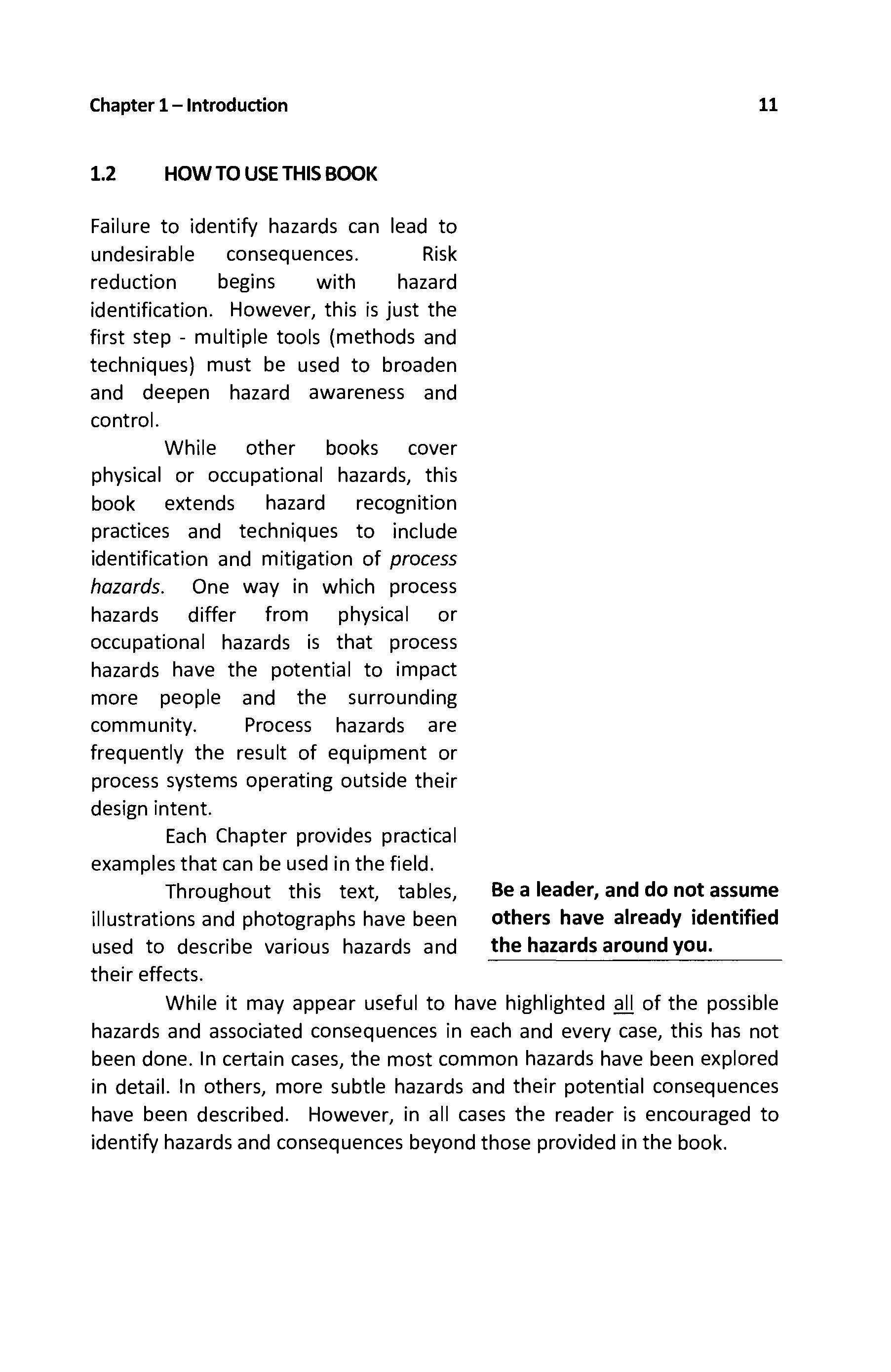 While it may appear useful to have highlighted all of the possible hazards and associated consequences in each and every case, this has not been done. In certain cases, the most common hazards have been explored in detail. In others, more subtle hazards and their potential consequences have been described However, in all cases the reader is encouraged to identify hazards and consequences beyond those provided in the book