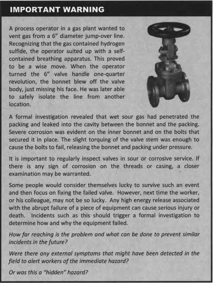 A process operato r in a gas plant wante d t o ven t gas fro m a 6 " diamete r jump-ove r line. Recognizing tha t th e gas containe d hydrogen sulfide, th e operato r suited up wit h a selfcontaine d breathin g apparatus. This proved t o be a wise move Whe n th e operato r turne d th e 6 " valve handle one-quarte r revolution , th e bonne t blew of f th e valve body, jus t missing his face He was later able t o safely isolate th e line fro m anothe r location