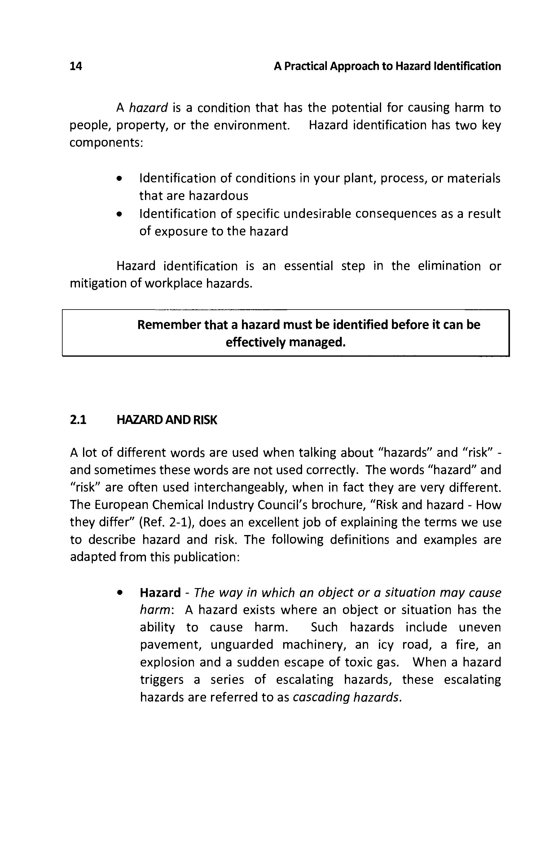 A lot of different words are used when talking about "hazards" and "risk"and sometimes these words are not used correctly The words "hazard" and "risk" are often used interchangeably, when in fact they are very different The European Chemical Industry Council's brochure, "Risk and hazard - How they differ" (Ref. 2-1), does an excellent job of explaining the terms we use to describe hazard and risk. The following definitions and examples are adapted from this publication: