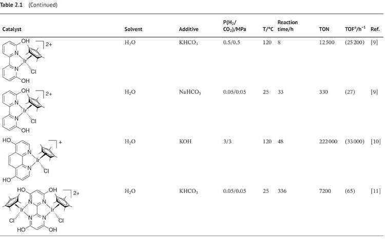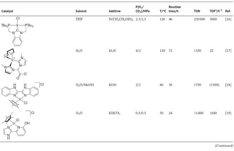 Among the commonly used precious metal–based catalysts, Ir catalysts exhibit high activity for CO2 hydrogenation. Ir complexes with functionalized ligands show remarkable catalytic activity. This section covers the development of different types of ligands, especially tautomerizable ligands (i.e. pyridinol, diazole, amide, and pincer ligands) for highly efficient Ir complexes.