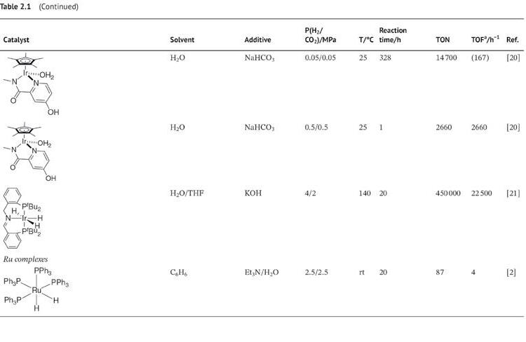 of tautomerizable ligands endow complexes with versatility for catalytic hydrogenation. In this chapter, the important role of ligands, especially tautomerizable ligands, is presented. CO2 hydrogenation is commonly promoted using inorganic or organic base, and further acidification is required to obtain pure FA. The direct hydrogenation of CO2 to FA under base-free conditions has recently been achieved albeit with a relatively low activity. Process design and development enable the production of pure FA and the recycling of homogeneous catalysts. The important progresses in catalyst activity, reaction mechanism, and process development are discussed herein.
