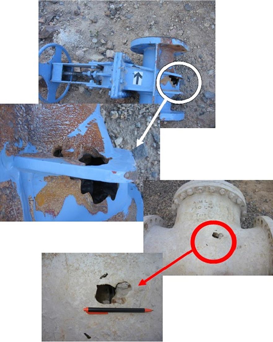 Figure2.1 Twoexamplesofseverelycorrodedequipmentleadingintoathrough-wall localizedfailure.Theanodeisthepointatwhichperforationhasoccurred(whitearrow)and thecathodeisimmediatelyadjacenttoitsothatelectronflowhappensviathemetallic surface(orangearrow),whileionictransferhappensthroughthemoisturelayeralready formedonthemetal.(Source: TakenfromthecollectionofDr.R.Javaherdashti.)