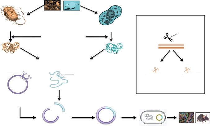 The advent of genetic engineering, also called rDT, started in 1952 with the discovery of Hershey and Chase, stating DNA as the genetic material (Hershey and Chase, 1952). Cohen and Boyer in the early 1970s were the first to show that the genetic material of one organism can be easily expressed in the other. Genetic engineering (Figure 1.1), in general, is the process in which the DNA is extracted, modified, transformed into a host cell, and a new organism is formed. The DNA from the desired organism is extracted and purified. It is then cleaved using restriction enzymes to get the gene of interest from it. The DNA fragment is then ligated into a vector, which acts as a driving vehicle for the DNA molecule to the host cells. This chimeric DNA molecule is then transformed into the host cells, and selection procedure under suitable stress conditions takes place. Finally, after numerous generations, the organism growing in the stress conditions is said to be recombinant or genetically modified. Genetic engineering has emerged as a crucial step in the development of industrial bioprocesses.