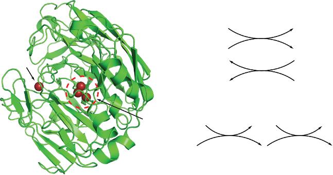 The T1 Cu is located in a substrate binding pocket close to the enzyme surface and is the initial electron acceptor in a one-electron oxidation of the substrates (Figure 1.3a). It has been proposed that the His458 and Asp206 residues can form hydrogen bonds with some of the substrates, helping to maintain them in the adequate conformation for electron transfer. Furthermore, computer simulations have shown that the H atom at ε-N in His458 is less than 5 Å away from the OH in phenolic substrates making it likely to participate in the electron transfer [20]. Once the T1 Cu2+ has been reduced to Cu1+, it transfers electrons one by one to the cluster formed by the other three Cu atoms (Figure 1.3b). This tri-nuclear cluster (TNC) is buried deeper inside the enzyme at the interface between two domains. In this cluster, oxygen is reduced to two molecules of water in a four-electron process that takes place as two sequential steps. First, the water is reduced in a two-electron process to a peroxide-level intermediate by the two T3 Cu1+ ions. Then, electrons from the T1 and T2 Cu1+ ions further reduce this intermediate to water (Figure 1.3c) [21, 22].