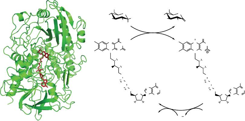 a semiquinone radical for the FAD flavine moiety and a superoxide anion radical for the O2 molecule (Figure 1.1b). Although not directly participating in the electron transfer, it is believed that His559 and Glu412 help with the pH control in the active site.