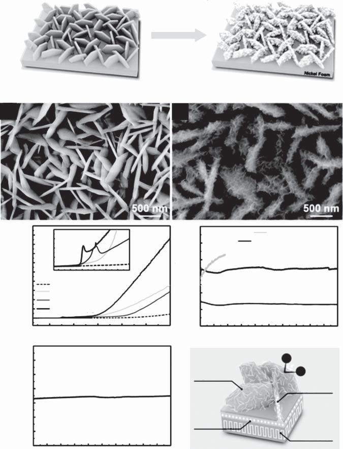 Sirisomboonchaietal.fabricatedcore–shellheterostructurecatalystsconsisting ofbinaryNiFeLDHsdecoratedonhierarchicalNiOmicroflakes(NiFeLDHs@NiO) throughatwo-stephydrothermal/post-thermalannealingprocedureforefficient OER[6].Thedevelopedarchitectureachievedalowoverpotentialof265mV affording10mAcm 2 currentdensityduetothewell-establishedcomposite microstructurewithstronginterfaceconnectionandinterfacialinteractionsthat facilitatedelectrontransferbetweencatalystsurfaceandNifoamascurrentcollector.Atthesametime,porouscore–shellarraymorphologysubstantiallyimproved thecontactsurfacebetweencompositecatalystandhydroxylreactantsinthe alkalineKOHelectrolyte,wheretheinterlayerNiOphasebetweenNiFeLDHsand NifoamsubstrateactsasamediatorforeffectiveelectrontransporttoNifoam.The outerultrathinNifeLDHnanosheetsalsowerewell-wrappedoverNiOmicroflakes, maximizingtheactivesiteexposuretohydroxylspecies.Moreover,theobserved apparentactivityofNiFeLDHs@NiOwasevenfurtheredthroughinsituintercalatingNiFeLDHnanoarraysinformamideorganicsolventat30 ∘ Cforjustfive minutesthroughanultrasoundtreatment.Thisresultedinpromotedionictransport andgasdiffusionchannelswithintheLDHslabs.ThetreatedNiFeLDHs@NiO heterostructurethenexhibitedstablehighcurrentdensitiesof50and100mAcm 2 for50hoursandasignificantlyreducedoverpotentialfor10mAcm 2 to210mV. ItwasdiscussedthatNiOintheintercalatedcompositecatalysteffectivelyfacilitatedthecleavageofHO—Hbondandthesubsequentconversionoftheadsorbed OHspeciestomolecularoxygen.NiFeLDHswithextendedinterlayerspacesalso suppliedabundantexposedactivesitesandhighlyincreasedmasstransferroutes foriondiffusion/electrontransferatthecatalyst–electrolyteinterface.