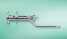 tion to open the joint space providing more room for instrument placement and tissue manipulation. The Leipzig stifle distractor (Figure 1.9 and Table 1.7) was designed specifically for this purpose. It is typically not needed for diagnostic examination of the stifle. Some minor surgical procedures in loose joints can be performed without the distractor, but its application is indicated for most operative procedures. It is attached to the distal femur and proximal tibia with fixation screws supplied with the distractor or bone pins can be used. This instrument provides for distal distraction of the tibia from the femur to open the joint space and cranial displacement of the tibial plateau to increase exposure of the menisci.